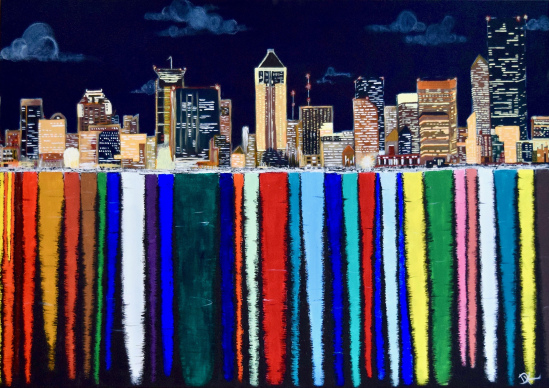 A cityscape scene on the water in the night, any city, any night, the decision is all yours! Beautiful reflections of colour on the water. Originally painted in acrylics.