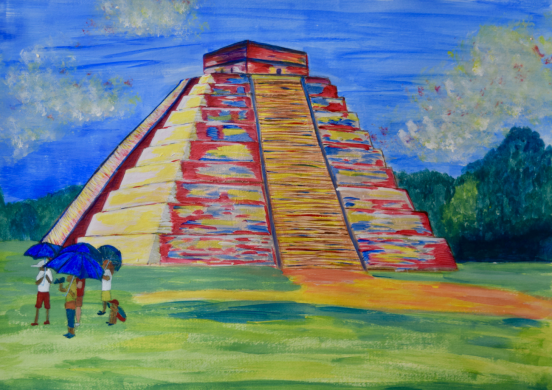 El Castillo or the Kukulkan Pyramid of Itza. At the brim of the well where the Wise Men of the Water Live, this is what Chichen Itza means in Maya. Located in the Yucatan region of Mexico. An amazing Mayan structure in a beautiful country, selected as one of the New Seven Wonders of the World in 2007. It definitely was a privilege to see this with my own eyes. Originally painted in acrylics.