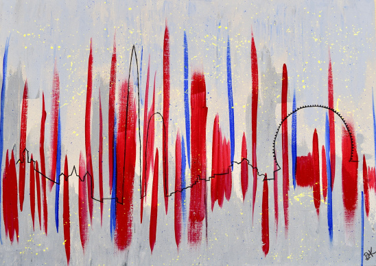 London's skyline across an abstract depiction of its heart rate in reds and blues