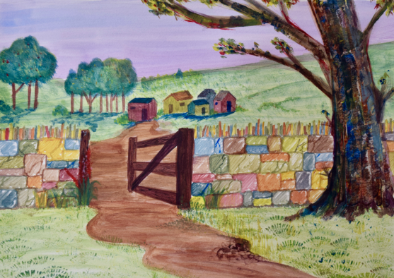 Wonder Wall full of colour and intrigue surrounded by colours in nature. An open gate, an open invitation into the world of colours within your imagination. Originally painted in acrylics