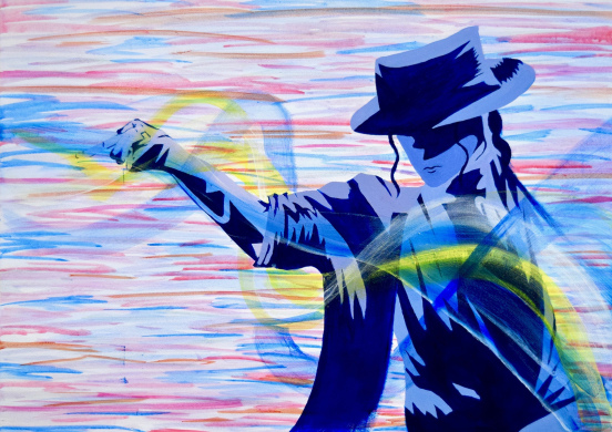 Michael Jackson fan art. The musical aura and how I think it envelopes a person depicted in art form. The pose, the hat, the hair, his iconic musical presence, everyone will recognise this legend. Originally painted in acrylics using a very limited palette of colours, it's amazing what you can do with just 4 colours colours!